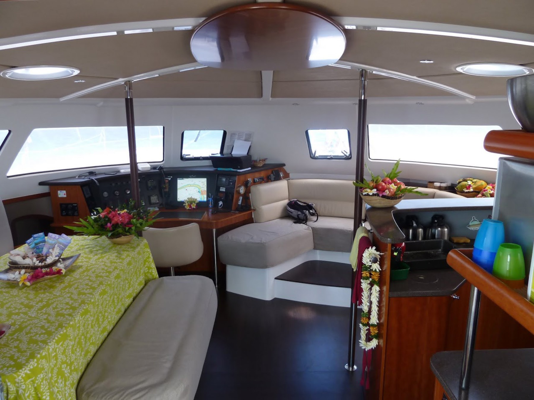 Le confort à bord est digne d’un hôtel : un vaste carré très confortable avec coin vidéo et salon bibliothèque, doté d’une cuisine américaine qui s’ouvre entièrement sur le cockpit. Ce dernier, abrité du soleil, dispose d’une grande table où sont servis les repas. Un bar à cocktails extérieur, équipé d’un frigo bar et d’une machine à glaçons, est à la disposition des passagers, tandis qu’une plancha-grill permet de savourer de délicieuses grillades. Le bateau possède un large sun deck offrant une vue panoramique sur le lagon, ainsi qu’un salon intime à l’avant et deux trampolines moelleux pour profiter pleinement de la mer.